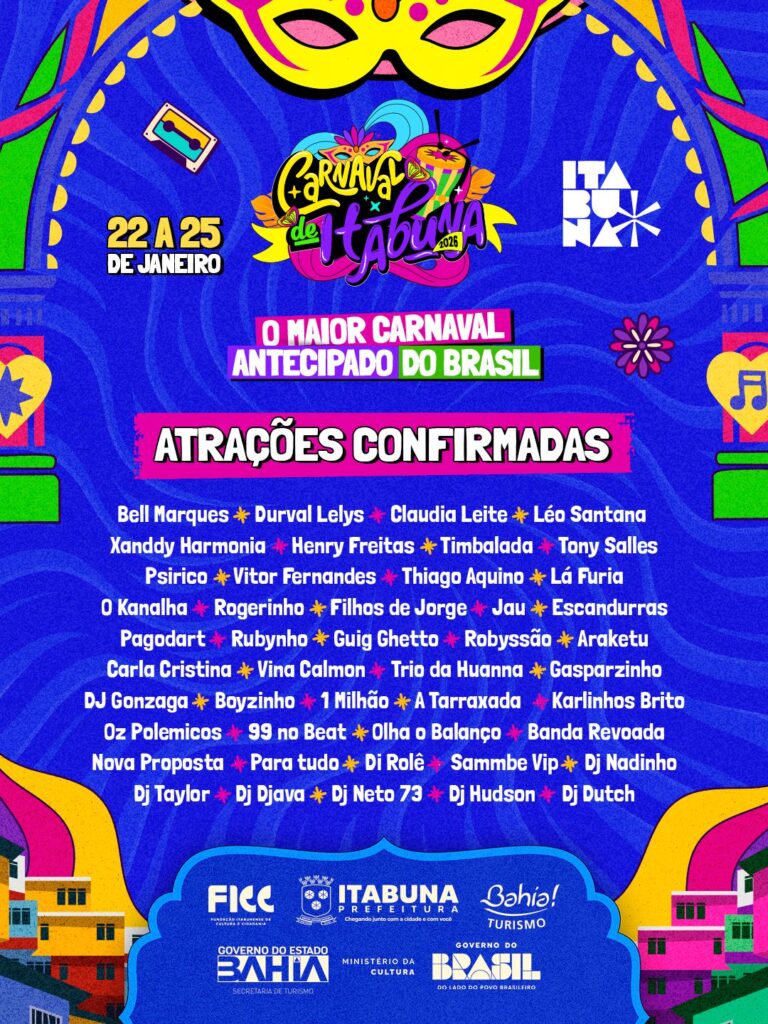 Com atrações de peso da música baiana como Bell Marques, Durval Lelys, Cláudia Leitte, Léo Santana, Xanddy Harmonia, Timbalada, Tony Salles, Psirico, Lá Fúria, O Kanalha, Escandurras, Trio da Huanna, Araketu e Guig Ghetto, e com a maior grade de sua história, o Carnaval Antecipado de Itabuna foi lançado na noite desta terça-feira, dia 6, no Centro de Cultura Adonias Filho. Neste ano, as atrações darão duas voltas no circuito, algo inédito em festas carnavalescas.