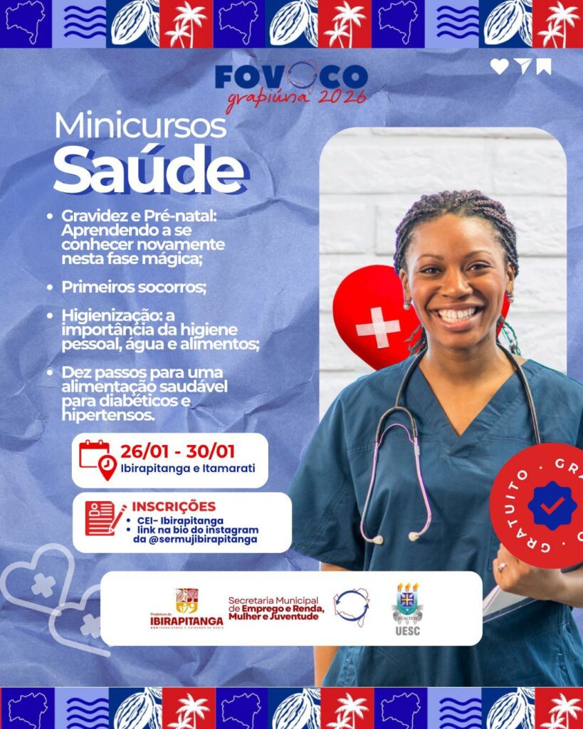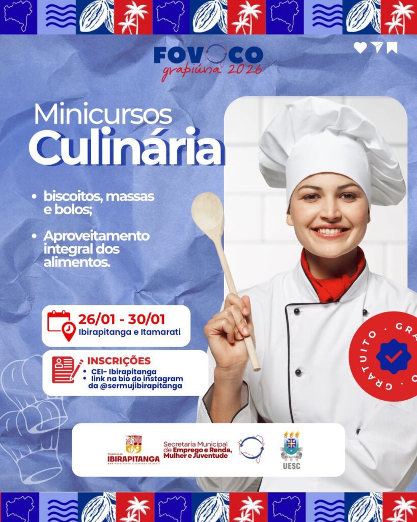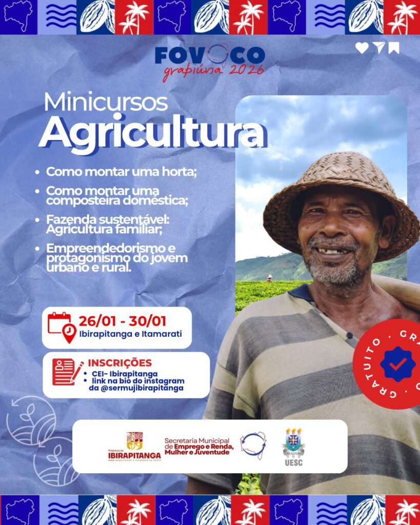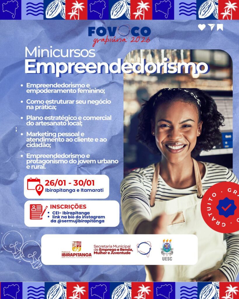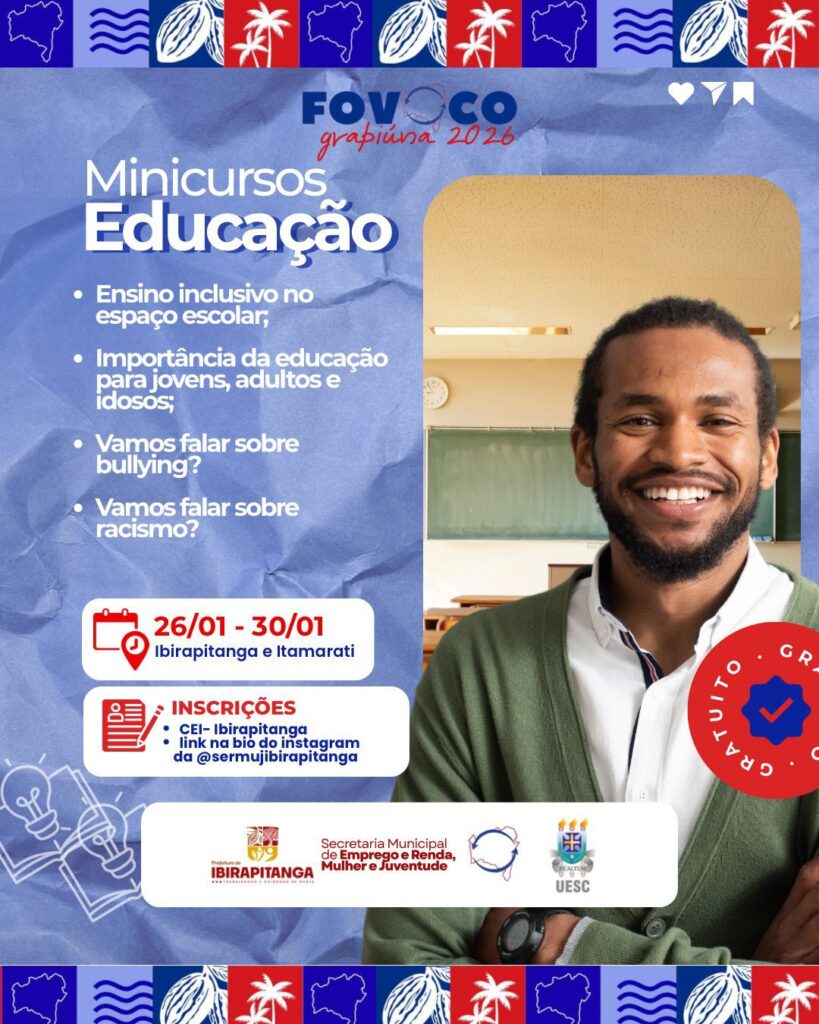 De 24 a 30 de janeiro, Ibirapitanga e o distrito de Itamarati recebem o FOVOCO Grapiúna 2026, uma grande mobilização de conhecimento e cidadania que promove oficinas, rodas de conversa, minicursos e atividades educativas voltadas ao empreendedorismo, à educação, à juventude, ao meio ambiente, à saúde e à inclusão social.