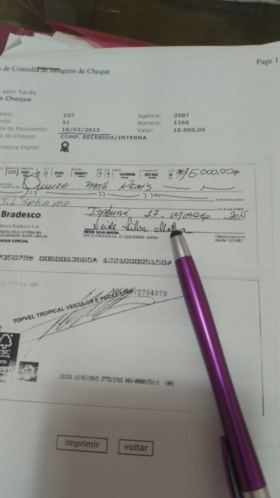 Vamos ao caso: Em 17 de março de 2015, três idosas e um obeso, residentes em Santa Cruz da Vitória, em face da precária assistência médica na cidade, se juntaram e compraram um veículo para transporta-los até Itabuna para as inúmeras consultas médicas e até internações. Para efetivar a compra foi emitido um cheque no valor de 15 mil reais como pagamento de entrada e financiado o saldo restante dividido em 48 parcelas. Financiamento aprovado, a concessionária TopVel recebeu do Banco  o valor financiado e o referido cheque de 15 mil reais emitido contra o Banco Bradesco, agência de Santa Cruz da Vitória.