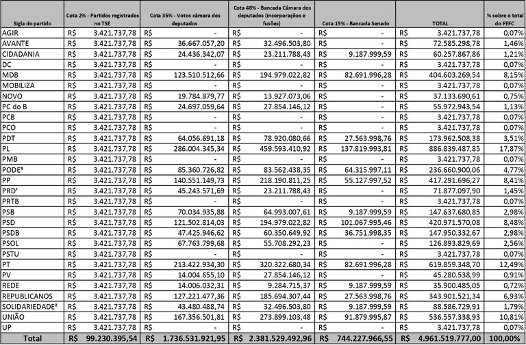 O Tribunal Superior Eleitoral (TSE) divulgou, na segunda-feira (17), os valores que cada partido vai receber do Fundo Especial de Financiamento de Campanha (FEFC), seguindo o prazo fixado pelo calendário eleitoral. Ao todo, 29 partidos receberão R$ 4.961.519.777,00, valor estabelecido pelo Congresso Nacional para gastos com a corrida eleitoral deste ano. Os critérios da divisão também foram fixados em lei pelo parlamento (Lei nº 9.504/1997, artigo 16-D).