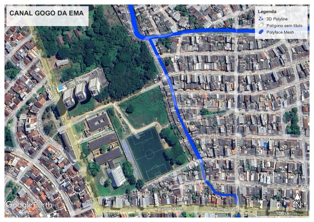 Planta do canal de macrodrenagem (destaque em azul), da localidade Gogó da Ema (bairro Sarinha), uma das seis comunidades beneficiadas com o Programa de Revitalização dos Canais de Macrodrenagem.
