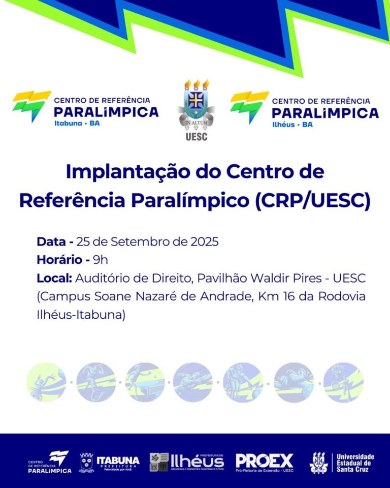 A Prefeitura de Itabuna, por meio do secretário municipal de Esportes e Lazer, José Alcântara Pelegrini, participa nesta quinta-feira, dia 25, às 9 horas, da solenidade de implantação do Centro de Referência Paralímpico da Universidade Estadual de Santa Cruz (CRP/UESC). O evento será realizado no auditório professor Altamirando Marques, no Pavilhão Waldir Pires, Campus Soane Nazaré de Andrade, Km 16 da Rodovia Jorge Amado (Ilhéus–Itabuna).