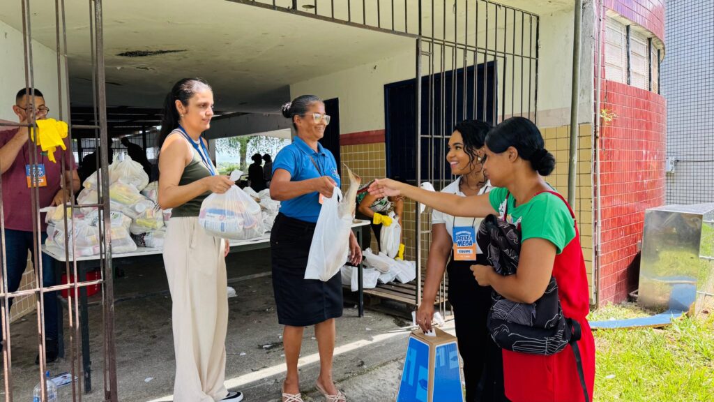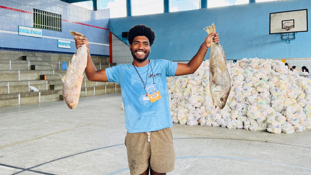 Nesta terça-feira, dia 15, um total de 22.500 famílias em situação de vulnerabilidade social receberam 45 mil quilos de peixes tipo Corvina, acompanhados de um kit composto por feijão, arroz, azeite de dendê, leite de coco e uma caixa de bombons de chocolate.