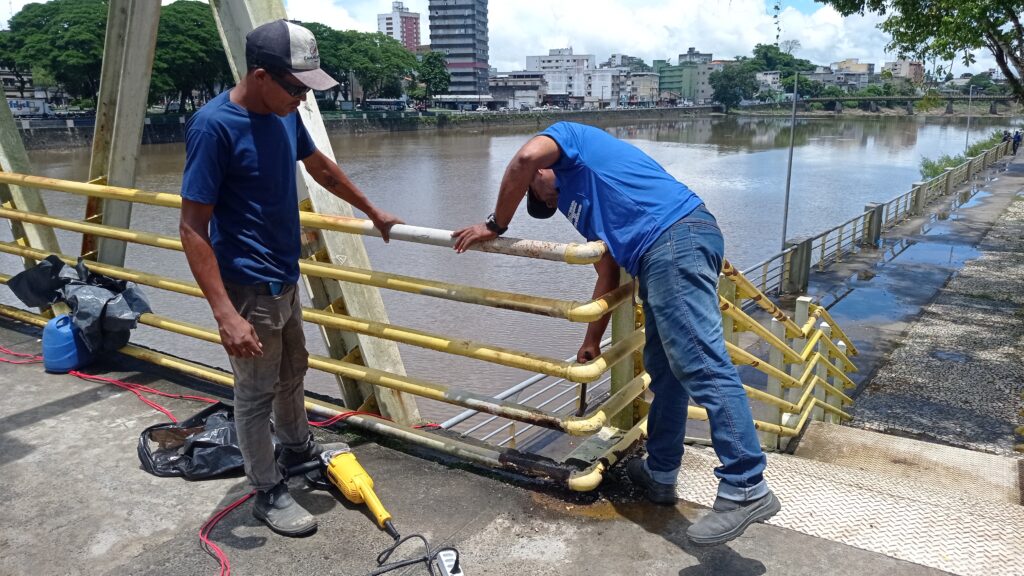 Nesta primeira fase, os operários da empresa responsável pelo trabalho estão cortando os tubos corroídos pela oxidação (ferrugem) nos guarda-corpos da estrutura de acesso,.O passo seguinte, será a recomposição das ferragens com tubulação nova que receberá pintura antiferrugem, passando à outra etapa a recuperação de estruturas ao longo do equipamento público.