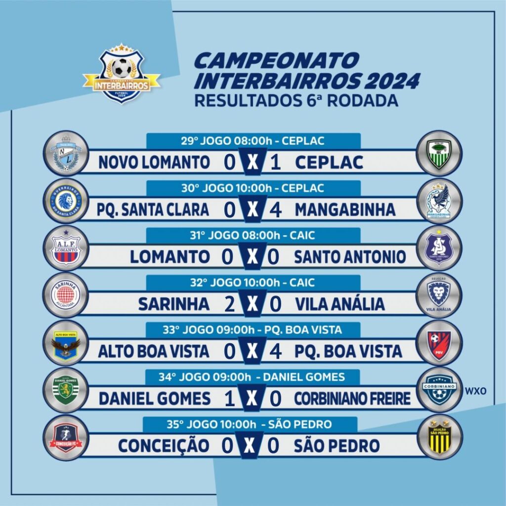 A chuva não desanimou quem foi assistir à 6ª rodada do Campeonato Interbairros de Futebol realizado pela Secretaria de Esportes e Lazer no domingo, dia 11. Os últimos jogos da primeira fase aconteceram em cinco campos da cidade e o resultado foi a classificação das seleções do Santo Antônio e do Conceição para as oitavas de final.