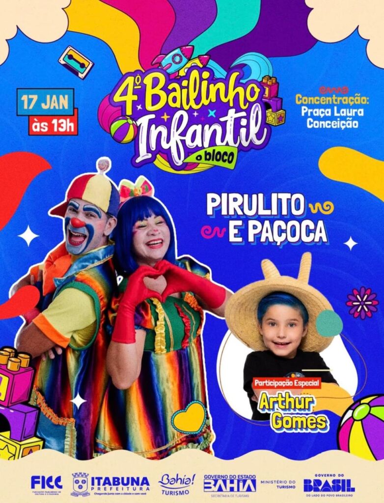 Para as crianças, neste sábado, às 14 horas, na Praça Adami, será realizada a 4ª edição do Bailinho Infantil, uma programação especial, cheia de alegria, cores e diversão, com Pirulito e Paçoca e a participação especial de Arthur Gomes, novo talento mirim que conquistou o país. A concentração será uma hora antes, na Praça Laura Conceição.