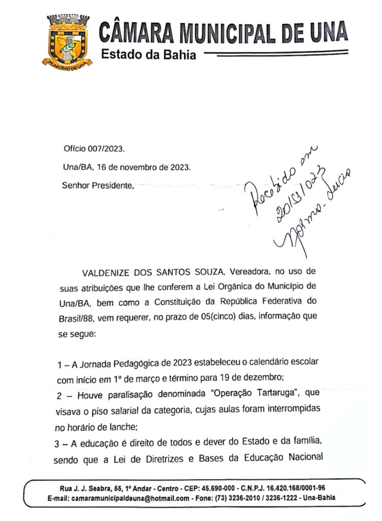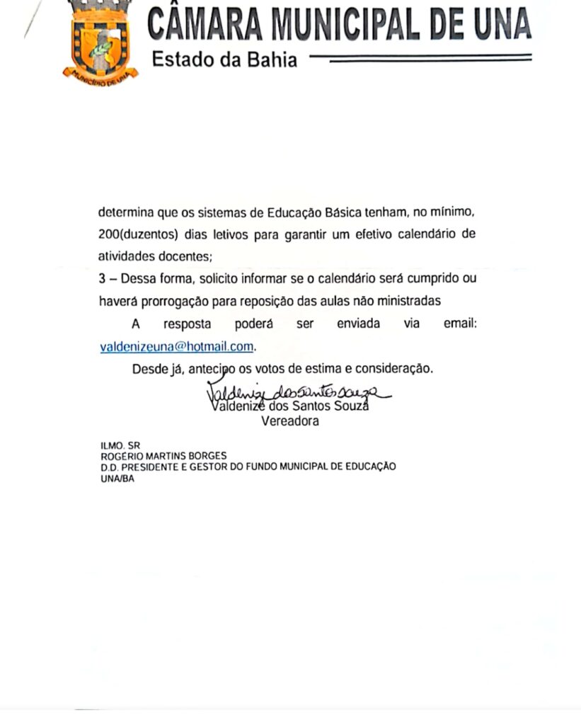 A vereadora Valdenize cobrou no dia 16 de novembro na Câmara Municipal a publicação oficial por parte da Prefeitura de Una da garantia de que o ano letivo na rede municipal se estenderá até o dia 20 de dezembro de 2023 e da confirmação dos 200 dias letivos aos estudantes, conforme determina a lei.